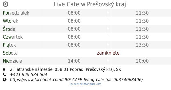 ::V Poprade je to jedno z mála miest ktoré mám rád. Je to nefajčiarske prostredie tak že neodídete v zasmradených šatách. Je tu široka ponuka nápojov a daju sa objednaj aj kolače. Vhodne prostredie pre všetky vekove kategorie, v ponuke spolocenske hry a ziva muzika. Radio hra v prijatelnej hlasitosti. Čašníčka ktora obsluhuje je čerešničkou na torte tohto podniku.